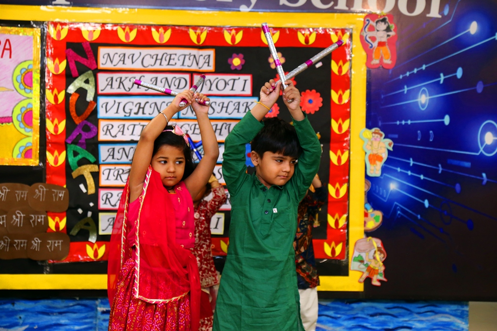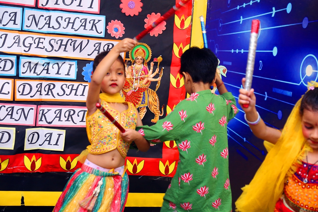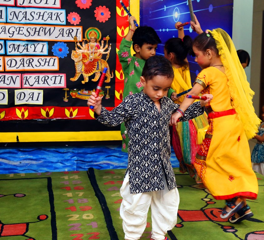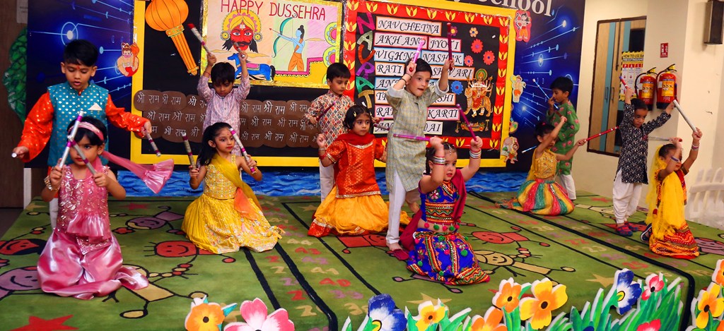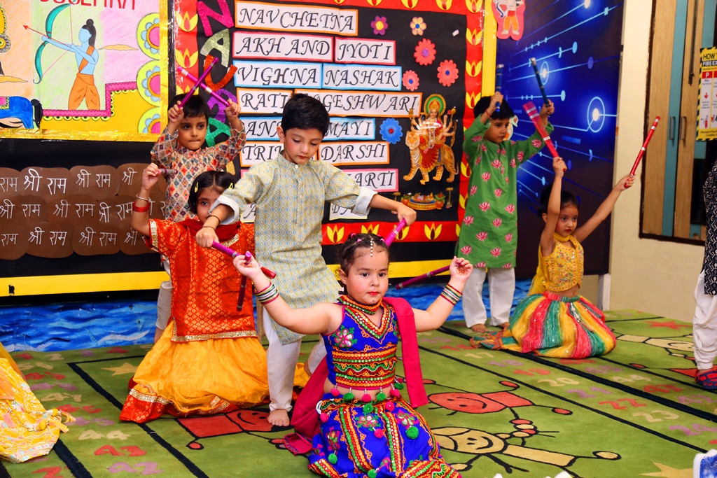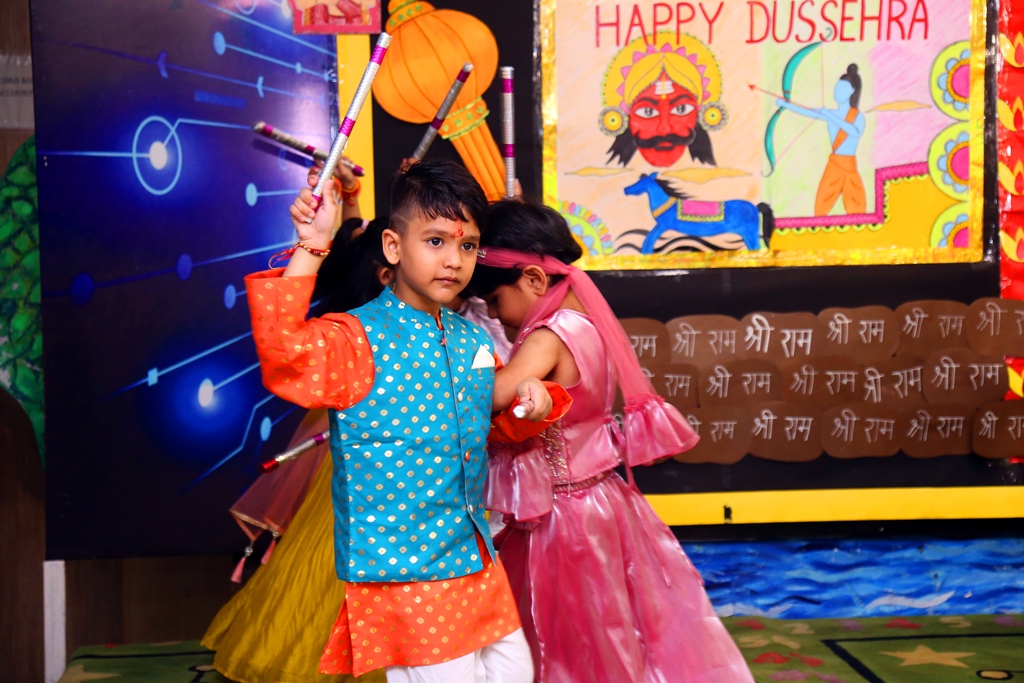 The victory of good over evil was depicted through spectacular performances - dramatization, songs, dances and narration. The life of Lord Rama and his victory over Ravana was well presented by the little ones of LKG. Tiny Tots of Nursery and LKG presented a beautiful dance celebrating the spirit of -Dandia Dance.