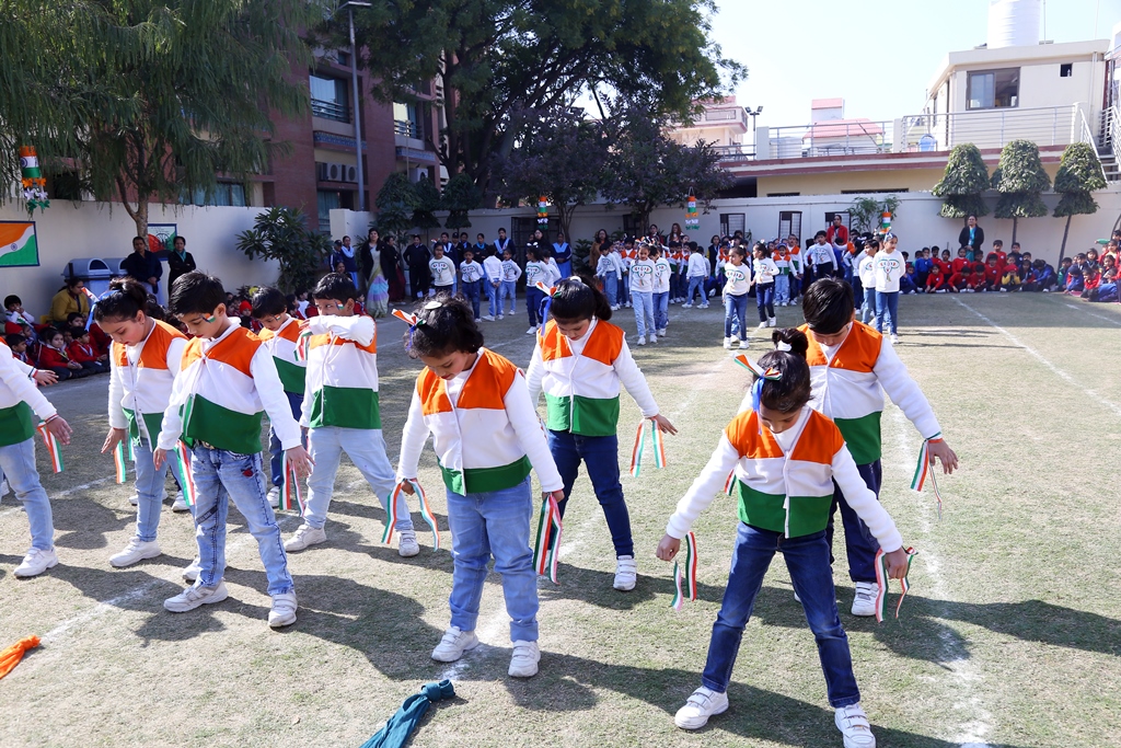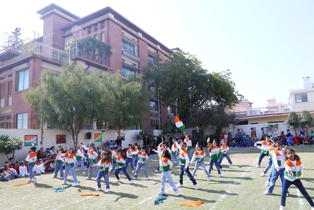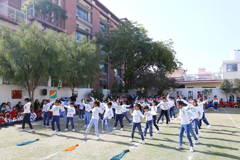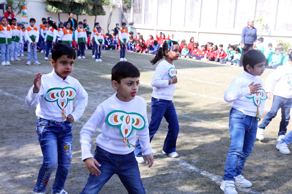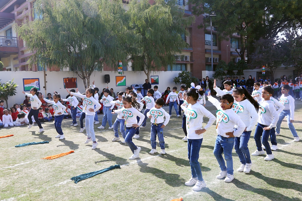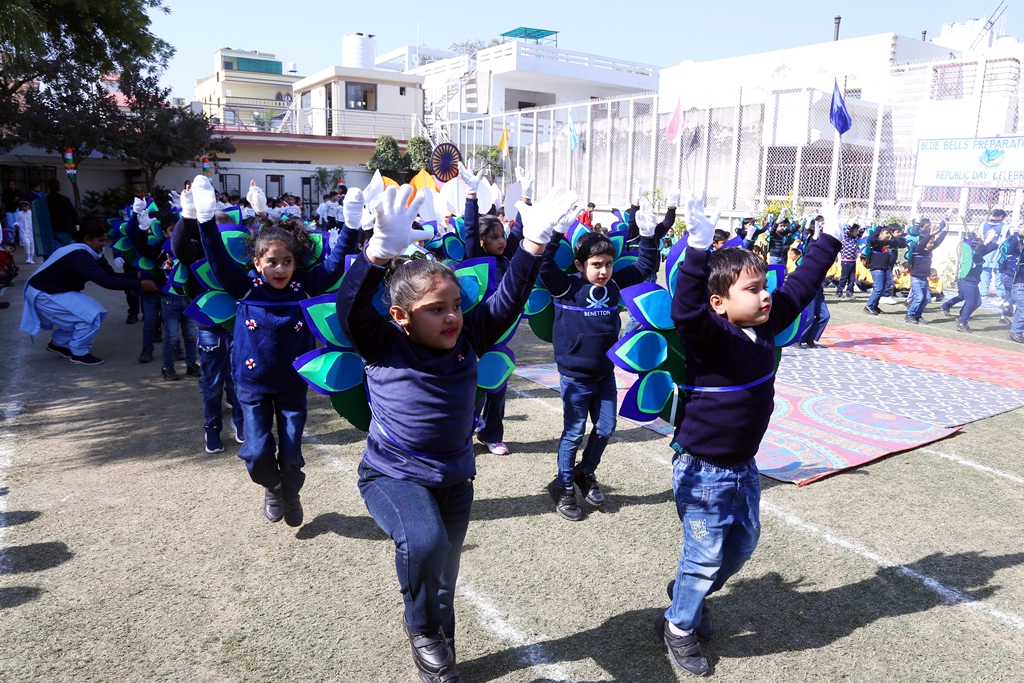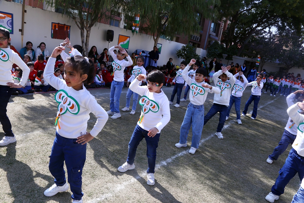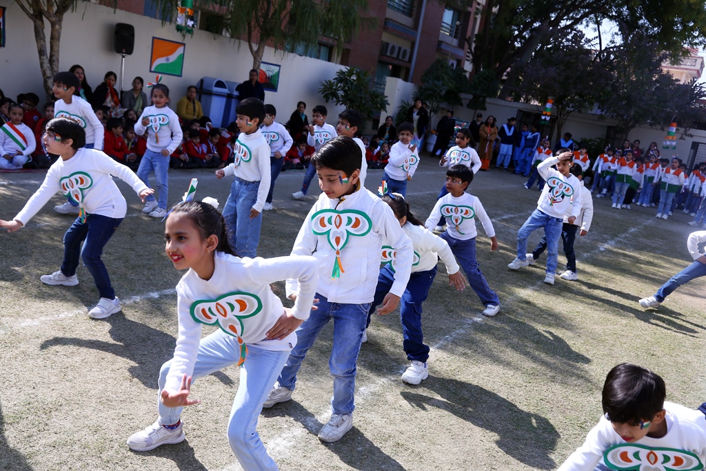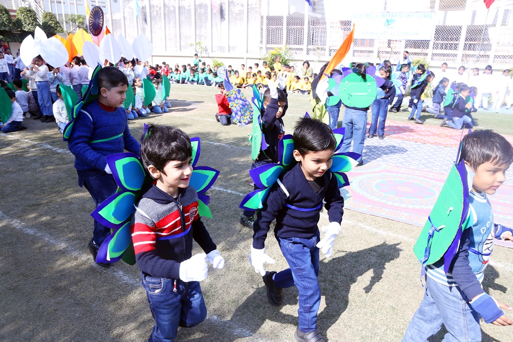 Feeling proud to belong to a glorious nation, the students, from Playgroup to Class II, participated in full strength to present a vibrant cultural programme that showcased their talent, commitment and dedication towards their nation. The students of class II enlightened their fellow mates about the significance of our Constitution and our Tricolor through a talk. The tiny tots of Play group, Nursery and LKG presented an action song and the students of Grades I and II portrayed the true colours of India through a patriotic rendition. The energetic Blue Bellians displayed a perfect synergy of body, mind and soul through a rhythmic drill and a captivating dance performance.