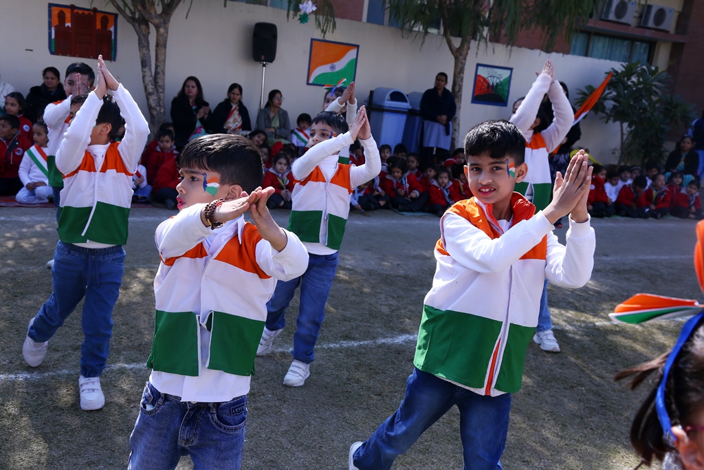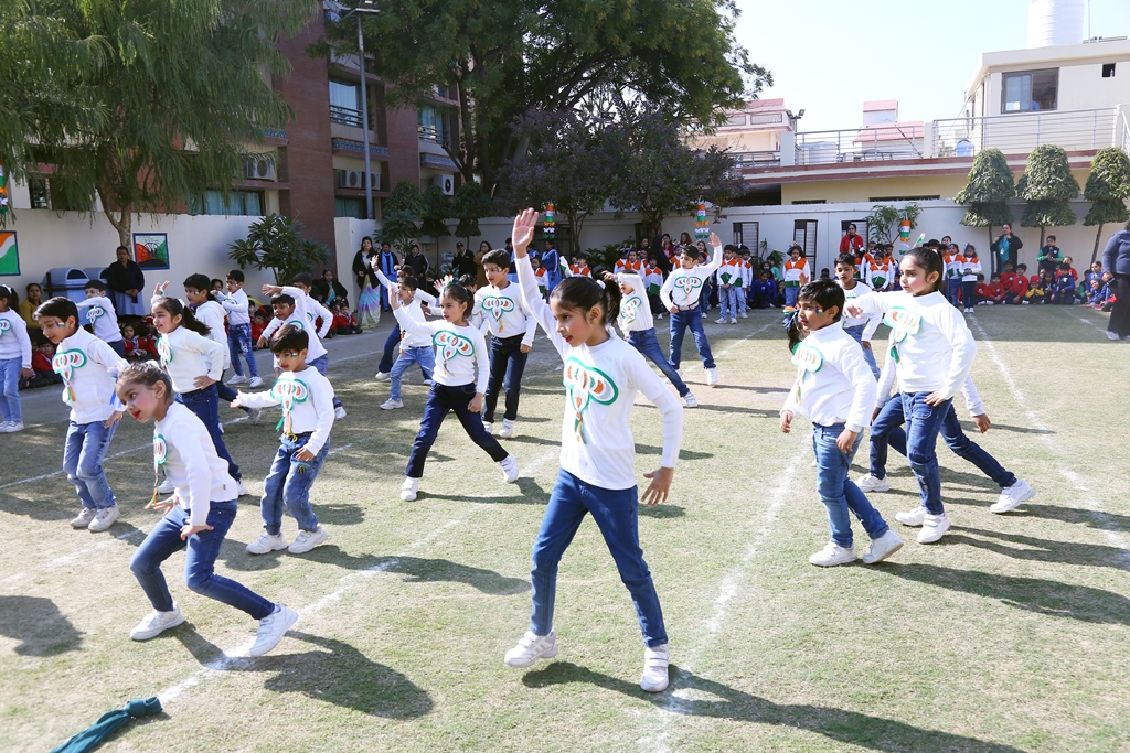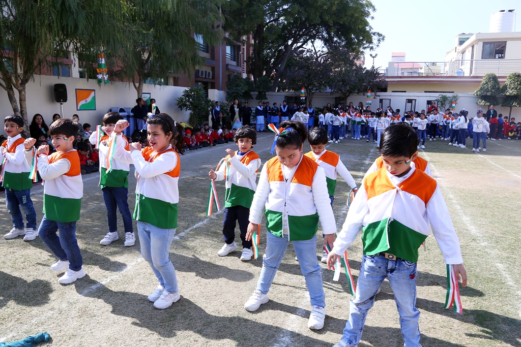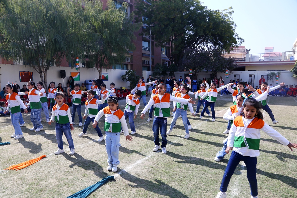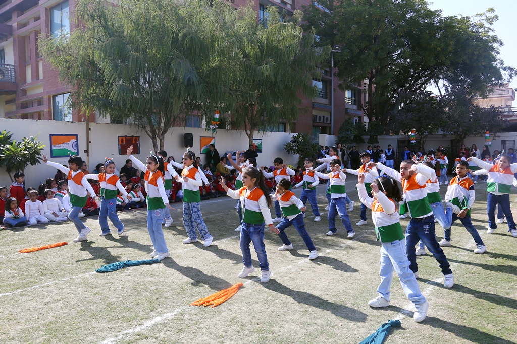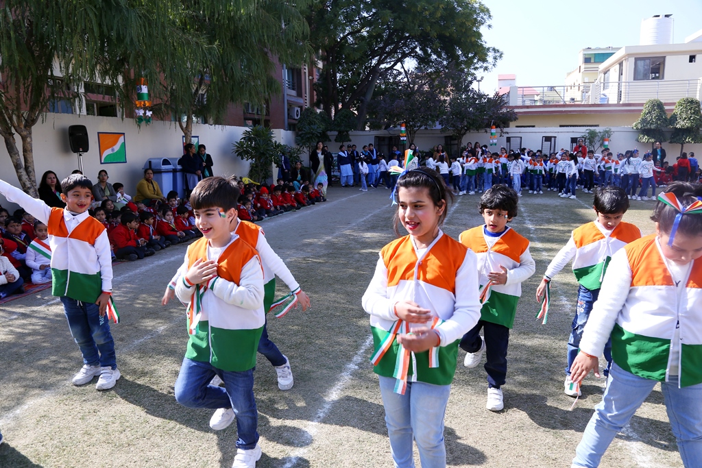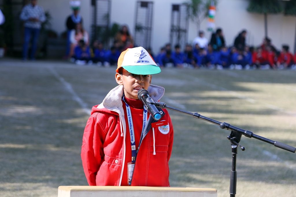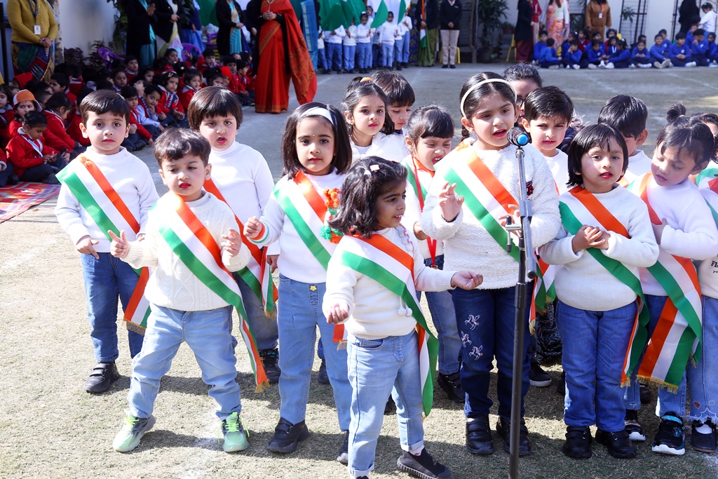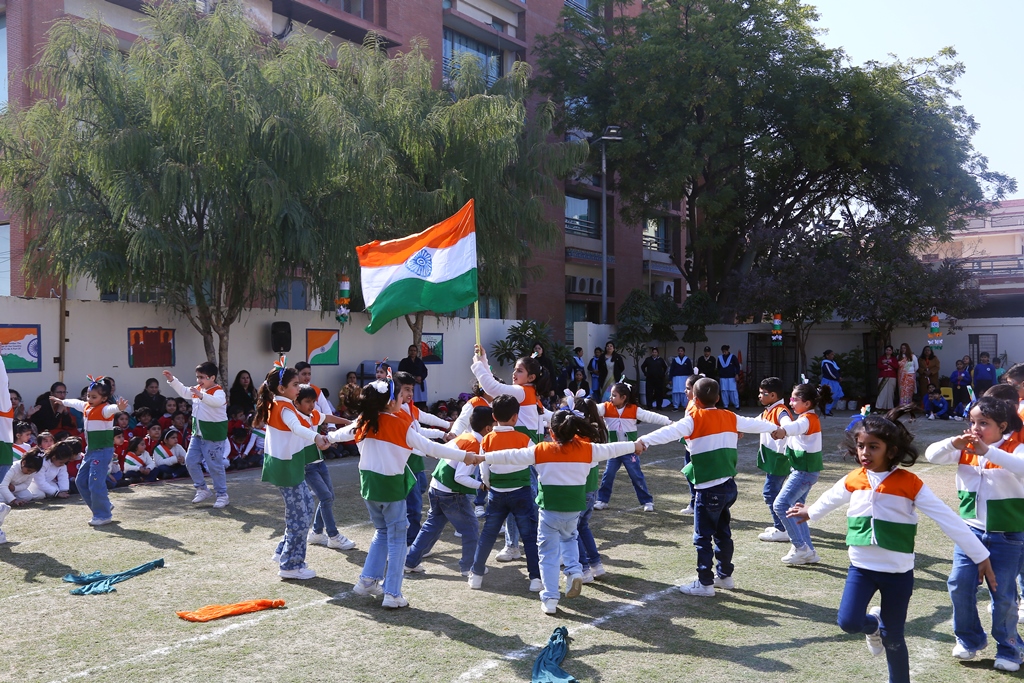 Feeling proud to belong to a glorious nation, the students, from Playgroup to Class II, participated in full strength to present a vibrant cultural programme that showcased their talent, commitment and dedication towards their nation. The students of class II enlightened their fellow mates about the significance of our Constitution and our Tricolor through a talk. The tiny tots of Play group, Nursery and LKG presented an action song and the students of Grades I and II portrayed the true colours of India through a patriotic rendition. The energetic Blue Bellians displayed a perfect synergy of body, mind and soul through a rhythmic drill and a captivating dance performance.