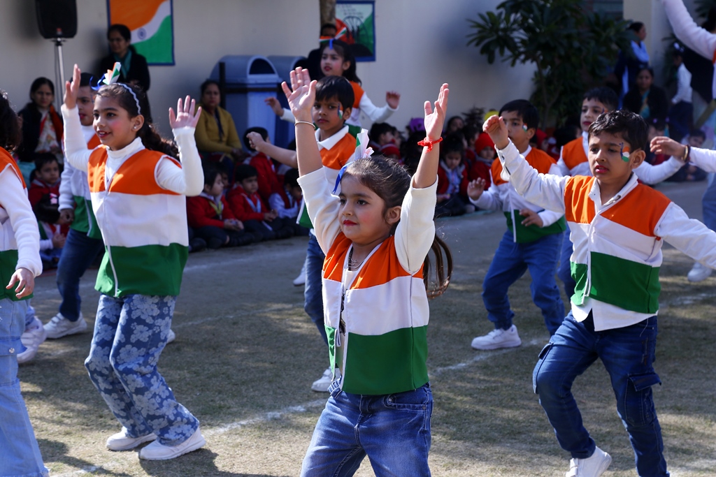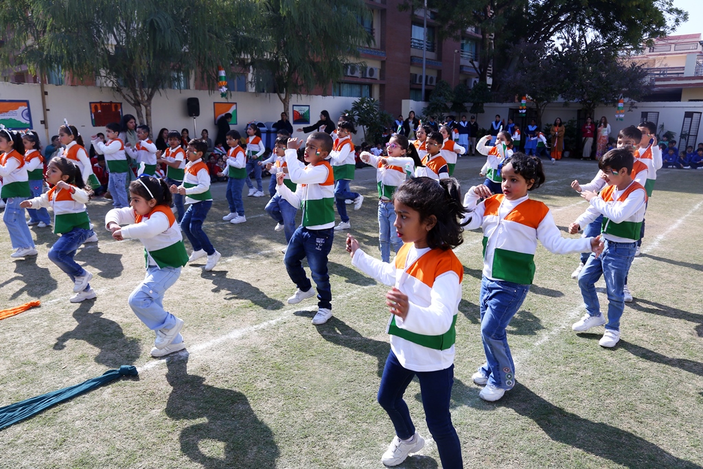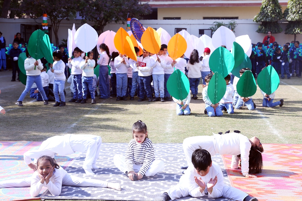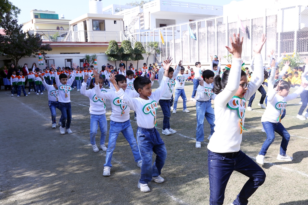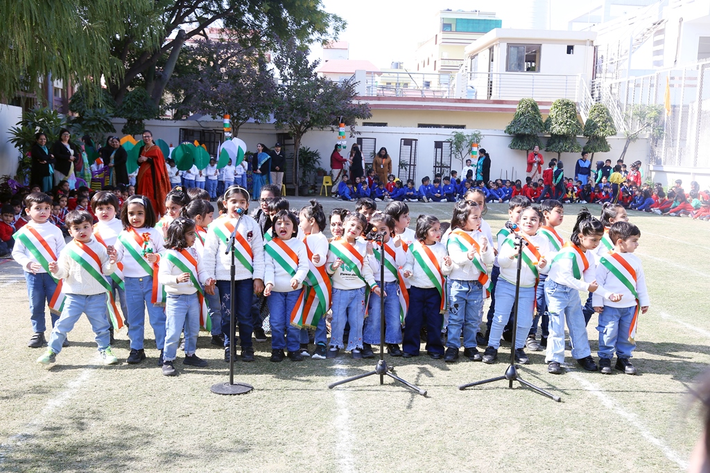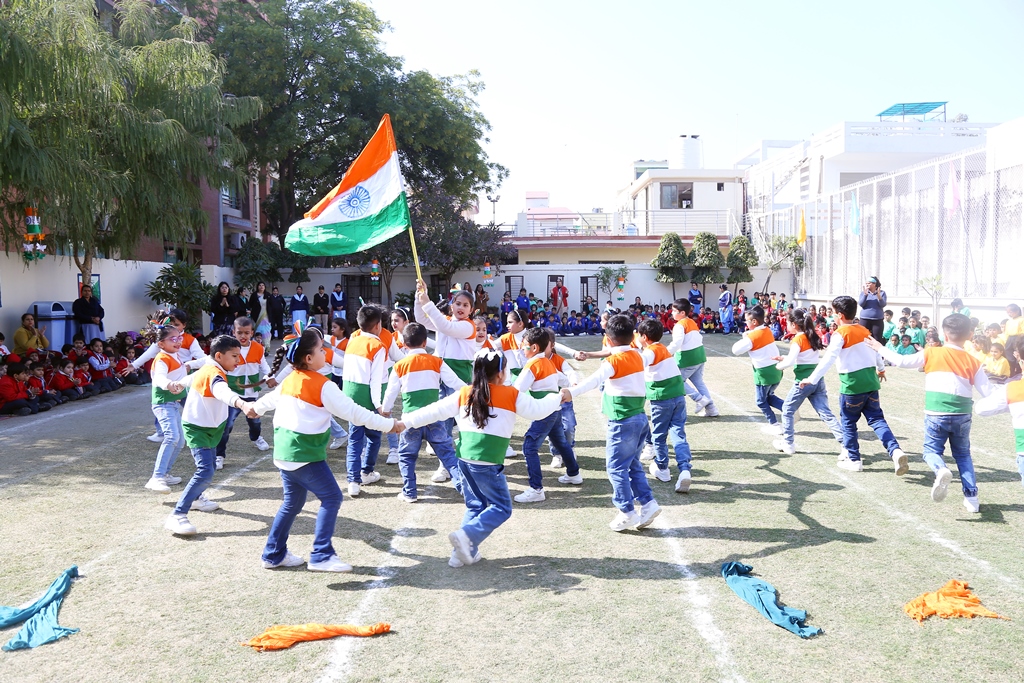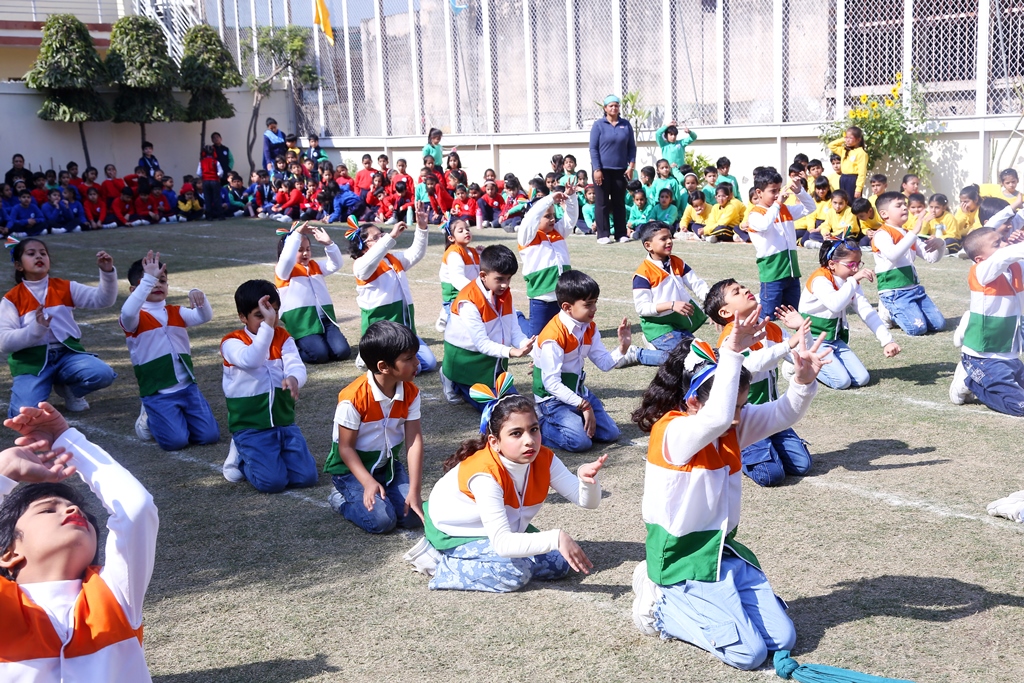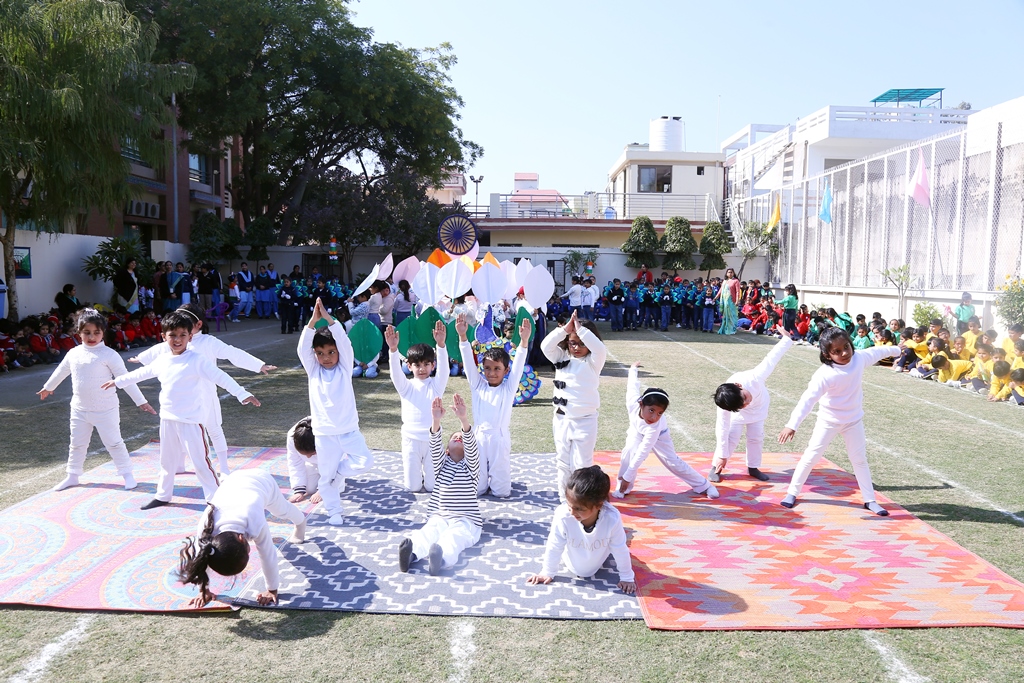 Feeling proud to belong to a glorious nation, the students, from Playgroup to Class II, participated in full strength to present a vibrant cultural programme that showcased their talent, commitment and dedication towards their nation. The students of class II enlightened their fellow mates about the significance of our Constitution and our Tricolor through a talk. The tiny tots of Play group, Nursery and LKG presented an action song and the students of Grades I and II portrayed the true colours of India through a patriotic rendition. The energetic Blue Bellians displayed a perfect synergy of body, mind and soul through a rhythmic drill and a captivating dance performance.
