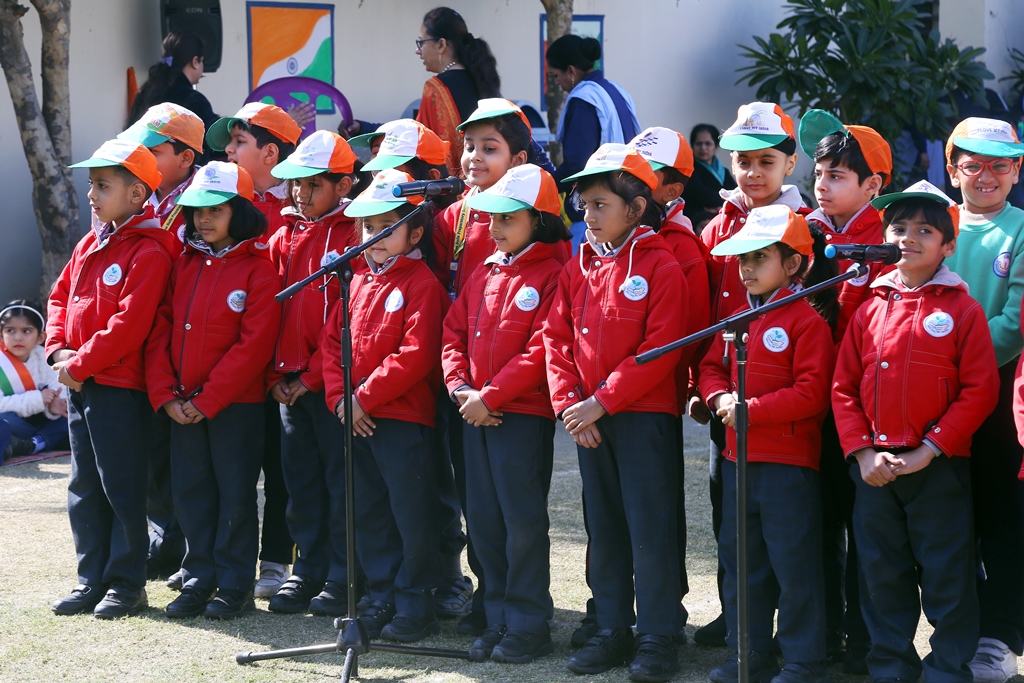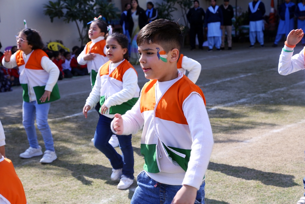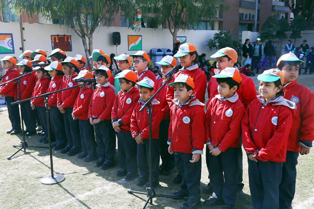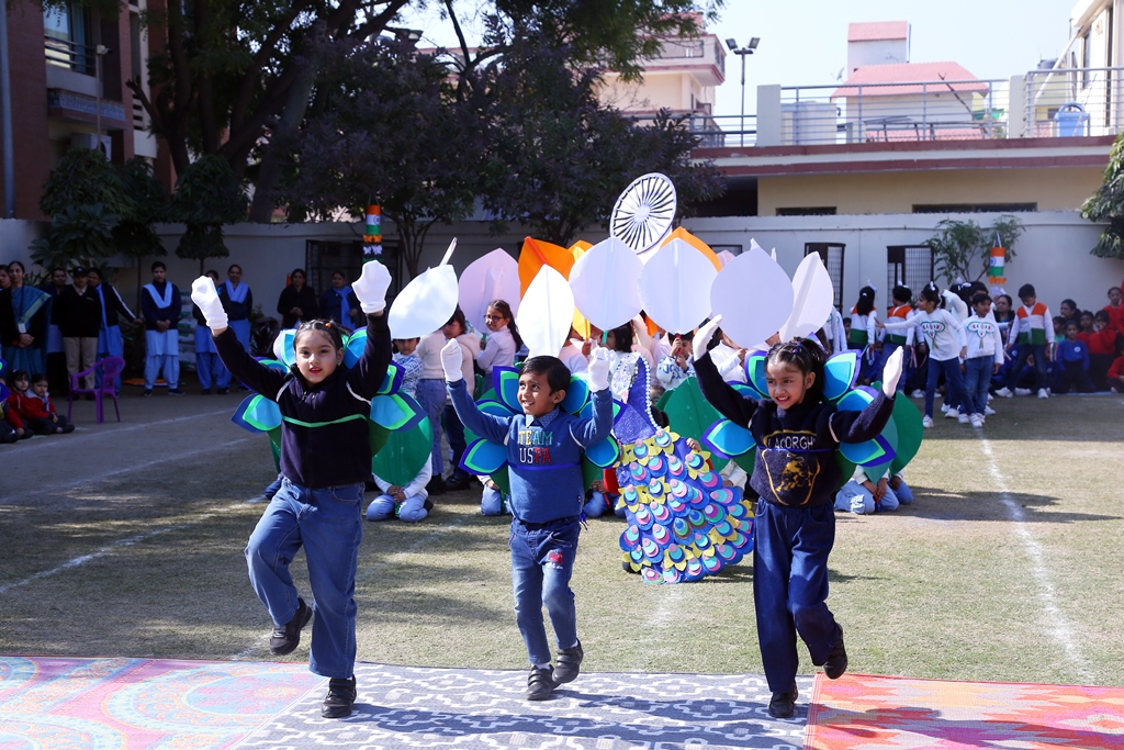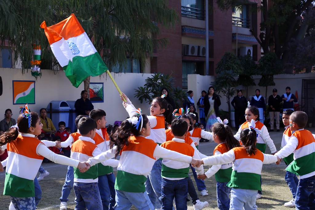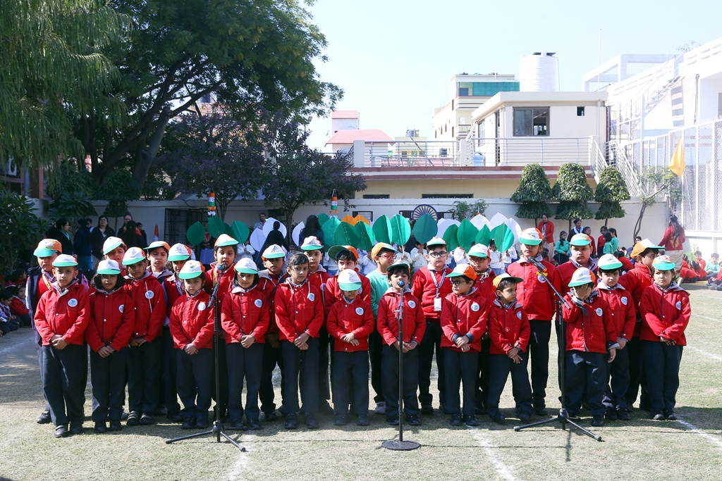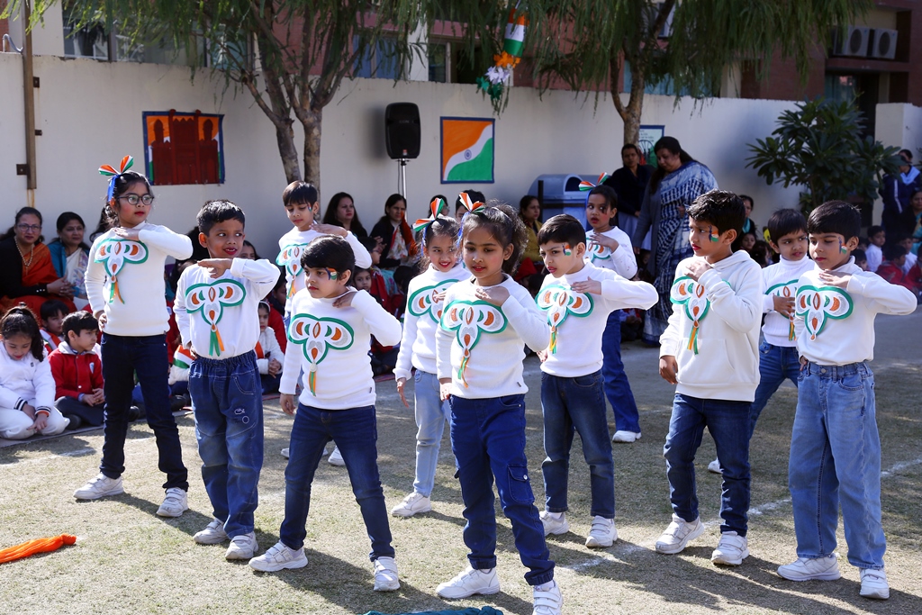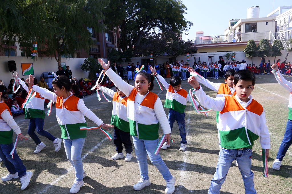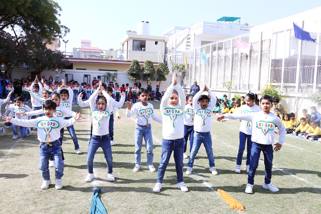 Feeling proud to belong to a glorious nation, the students, from Playgroup to Class II, participated in full strength to present a vibrant cultural programme that showcased their talent, commitment and dedication towards their nation. The students of class II enlightened their fellow mates about the significance of our Constitution and our Tricolor through a talk. The tiny tots of Play group, Nursery and LKG presented an action song and the students of Grades I and II portrayed the true colours of India through a patriotic rendition. The energetic Blue Bellians displayed a perfect synergy of body, mind and soul through a rhythmic drill and a captivating dance performance.