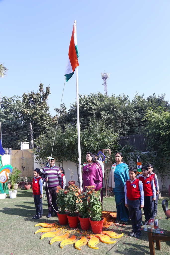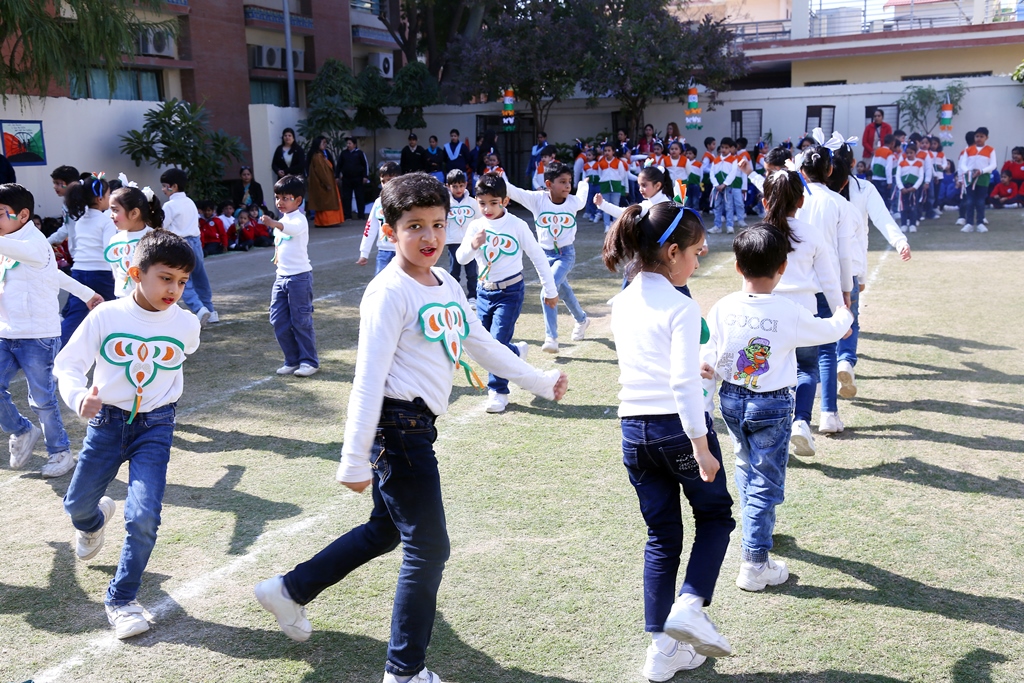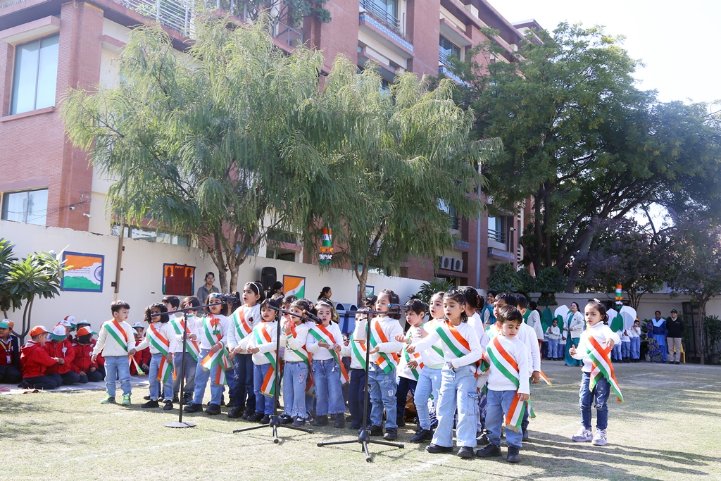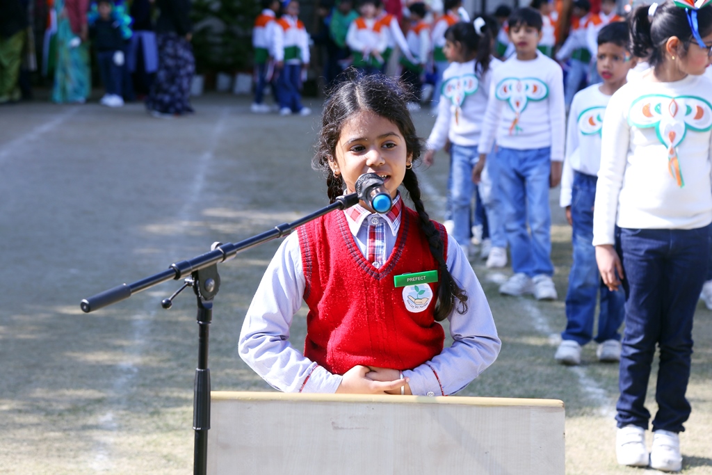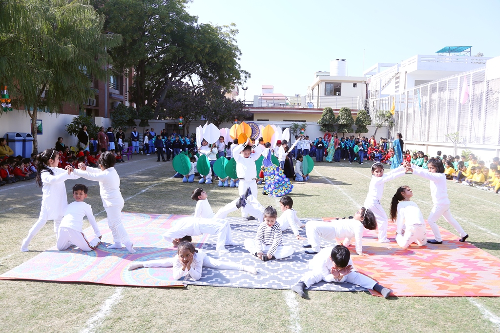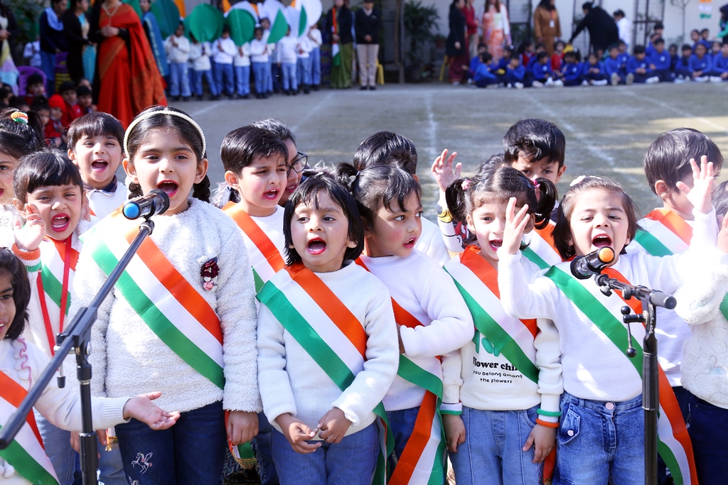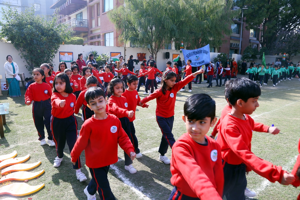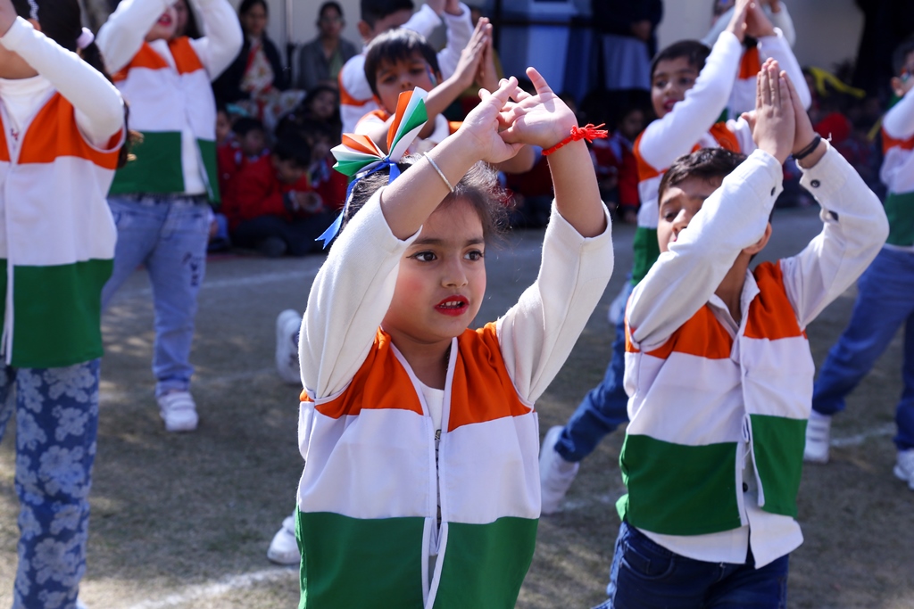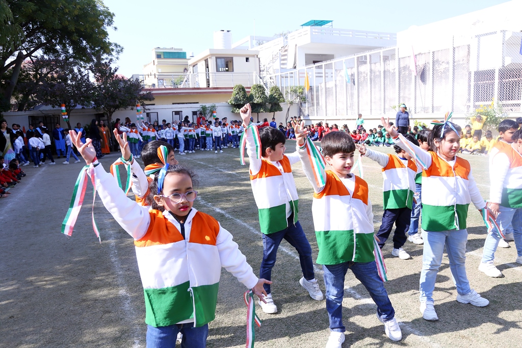 Feeling proud to belong to a glorious nation, the students, from Playgroup to Class II, participated in full strength to present a vibrant cultural programme that showcased their talent, commitment and dedication towards their nation. The students of class II enlightened their fellow mates about the significance of our Constitution and our Tricolor through a talk. The tiny tots of Play group, Nursery and LKG presented an action song and the students of Grades I and II portrayed the true colours of India through a patriotic rendition. The energetic Blue Bellians displayed a perfect synergy of body, mind and soul through a rhythmic drill and a captivating dance performance.
