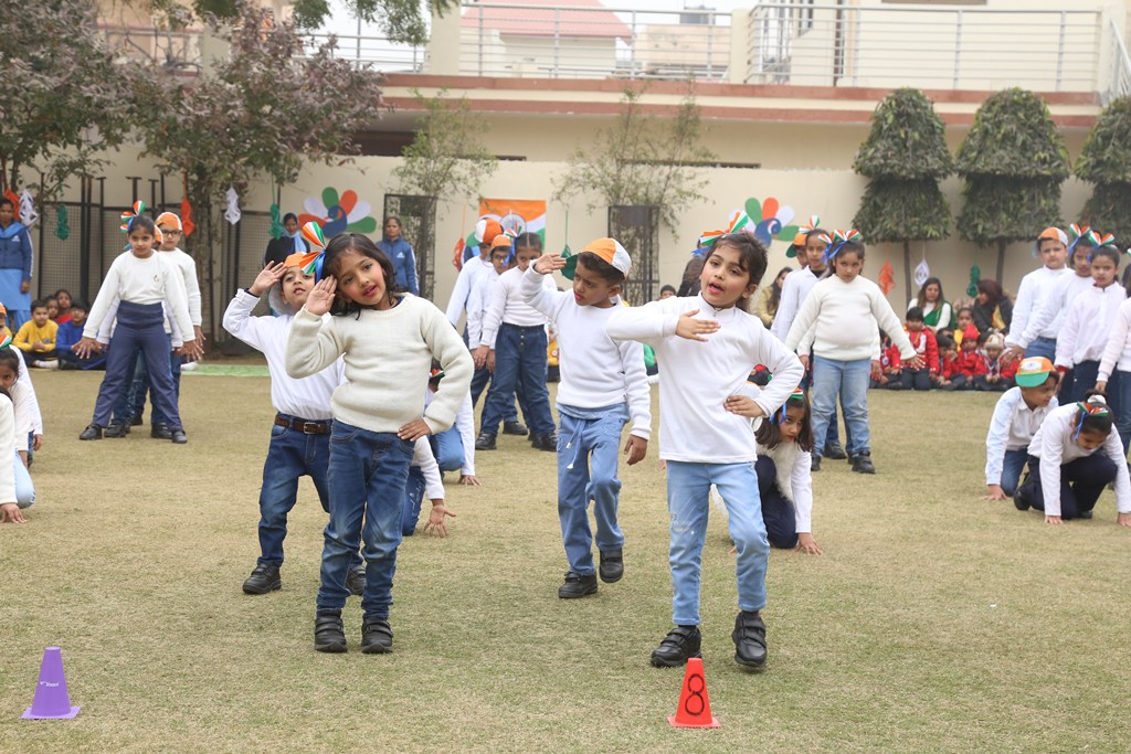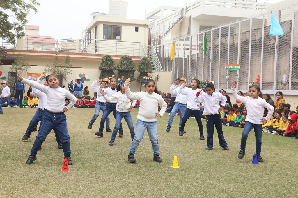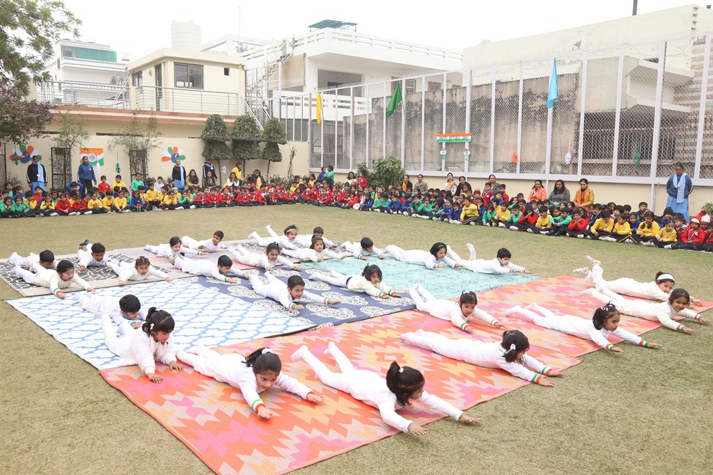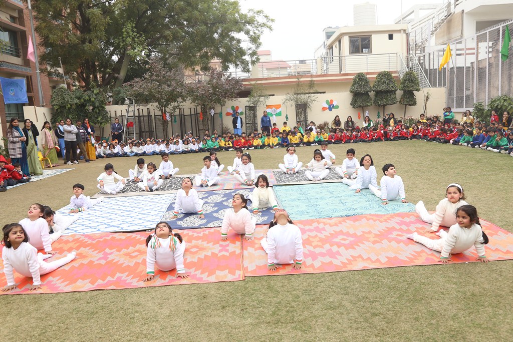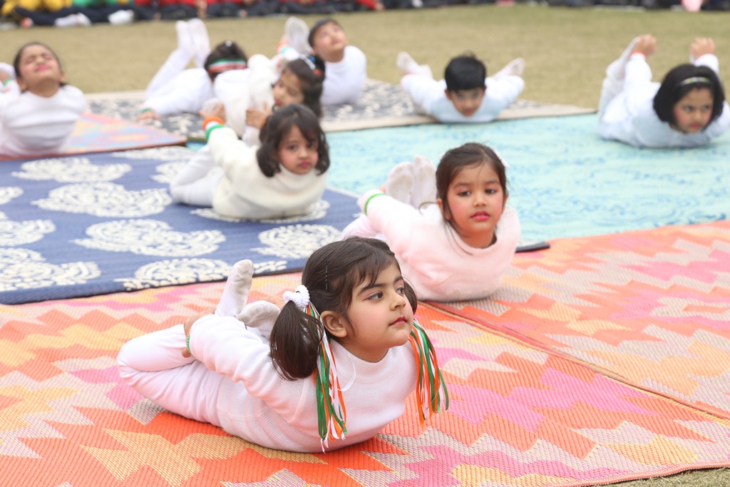 Participating in full strength, the students of classes Nur-II presented a vibrant cultural programme that included a talk, a patriotic action song and group song, yoga, musical rap in praise of our motherland and rhythmic dance.